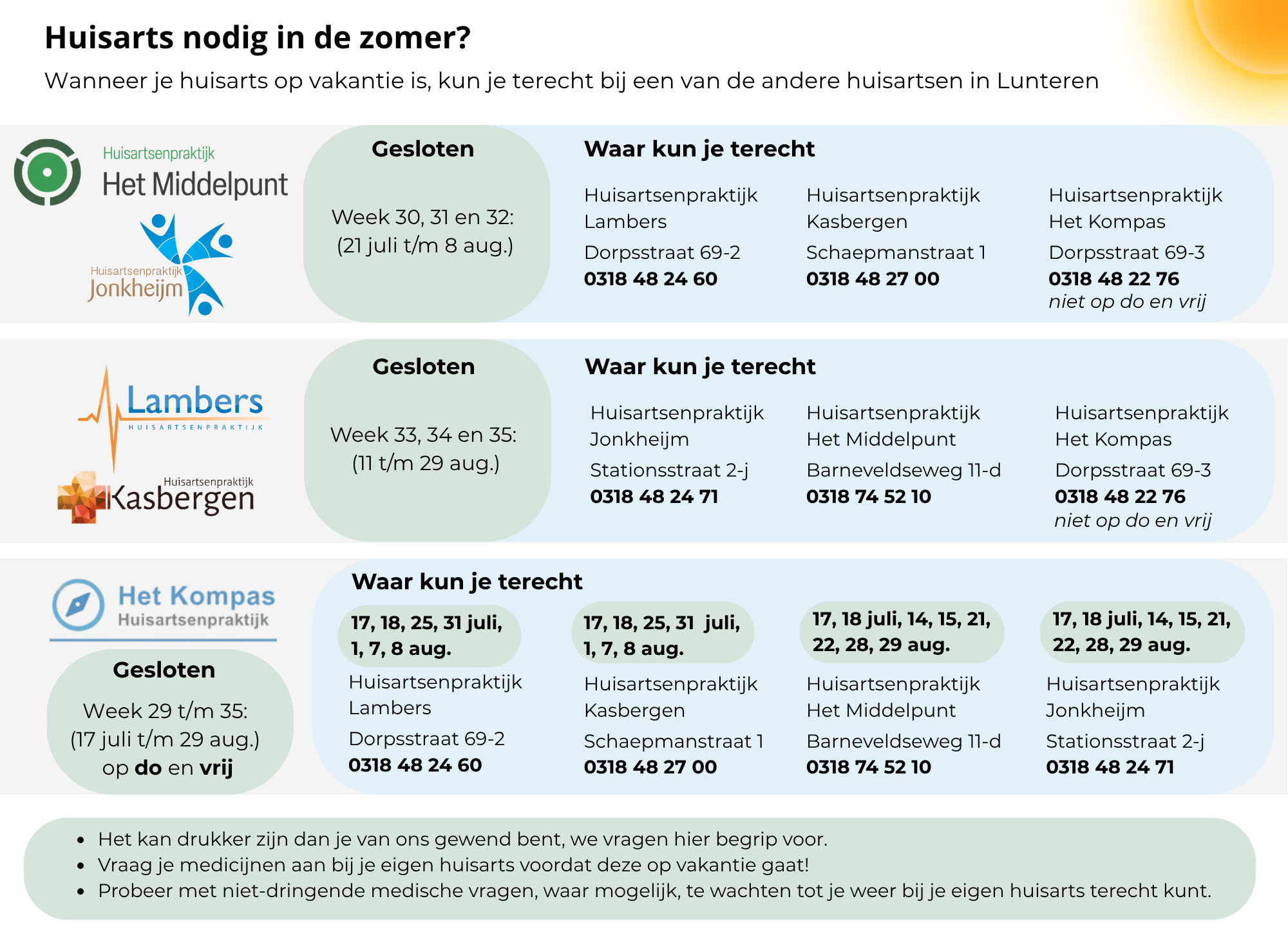 Tijdens de vakantieperiode van onze collega-huisartsen nemen wij de dringende medische zorg waar. Ook vakantiegangers uit de omliggende vakantieparken kunnen in geval van spoed bij ons terecht. Houd er rekening mee dat het in deze periode drukker kan zijn dan u van ons gewend bent. Wij vragen hiervoor uw begrip.